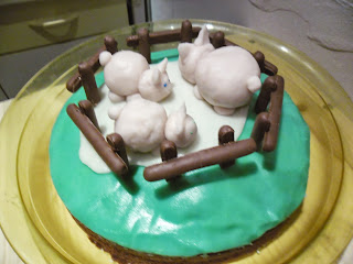 Réaliser ensuite la pâte à sucre express au citron et étaler cette pâte à sucre. Découper dans celle-ci une forme libre qui sera la mare des petits cochons.