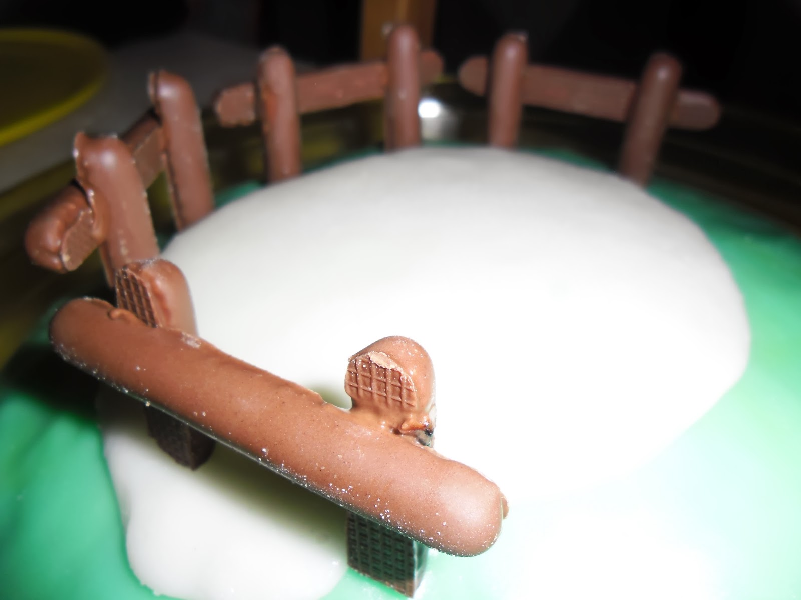 Poser la mare sur gâteau (par dessus la pâte à sucre express verte) et fixer les barrières.