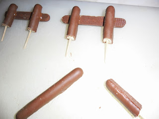 Faites fondre légèrement le chocolat au tiers de chacune des moitiés et fixer chaque moitié sur le finger encore entier.